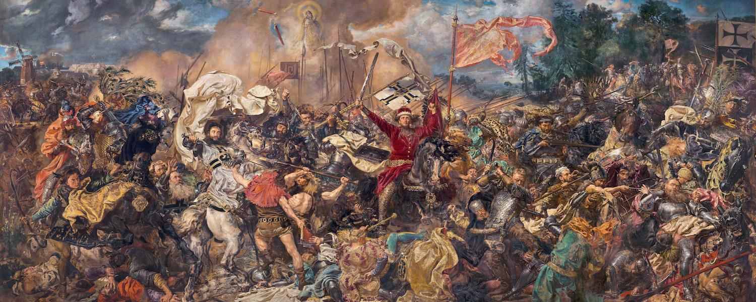 Jan Matejko należy do najbardziej znanych polskich malarzy. Był wielkim autorytetem dla pokaźnego grona swoich uczniów, zasłużonym pedagogiem i organizatorem szkolnictwa artystycznego w Krakowie, wybitnym artystą ze skrzywionym od pracy kręgosłupem. Dziś zaliczany jest do grona malarzy historycznych. Studia nad losami polskiego narodu pochłaniały Matejkę bez reszty. Był on autentycznym entuzjastą tej dziedziny wiedzy. Nie ograniczał się tylko do lektury dostępnych mu źródeł, lecz zwiedzając muzea i zbrojownie ówczesnego Wiednia i Drezna szkicował poszczególne elementy uzbrojenia. Na podstawie tych dwóch doświadczeń powoływał do życia swoje wielkoformatowe płótna. Najbardziej znanym dziełem Matejki jest Bitwa pod Grunwaldem. Tę imponujących rozmiarów kompozycję (424 x 987 cm.) mistrz stworzył w latach 1872 – 1878. Nie należy jednak traktować tego obrazu jako odnotowanie faktu historycznego. W ręce Witolda, autor „włożył” miecz z XVIII wieku. „Ubrał” księcia w wymyślony przez siebie pas, wykonany z elementów pozłacanego świecznika. Uczestnicy bitwy odziani są w stroje z różnych epok. Włócznia św. Maurycego, podarowana Bolesławowi Chrobremu w celach ewangelizacyjnych, pchnięta za chwilę przez jednego z wojów przebije bok Ulricha von Jungingena – rycerza, ale także zakonnika. „Wprowadza” do obrazu, nieuczestniczącego faktycznie w bitwie, czeskiego bohatera narodowego Jana Zizkę. Jednak te historyczne nieścisłości nie osłabiają siły wyrazu całego przedstawienia. Matejko w sposób absolutnie świadomy tworzy własną wizję tego nadzwyczajnego wydarzenia. Podobne odstępstwa mistrz stosuje w wielu innych swoich płótnach. Posługując się realistycznymi środkami wyrazu zamienia prawdę obiektywną na własną prawdę artystyczną. Czyni to w sposób tak sugestywny, że sporą część